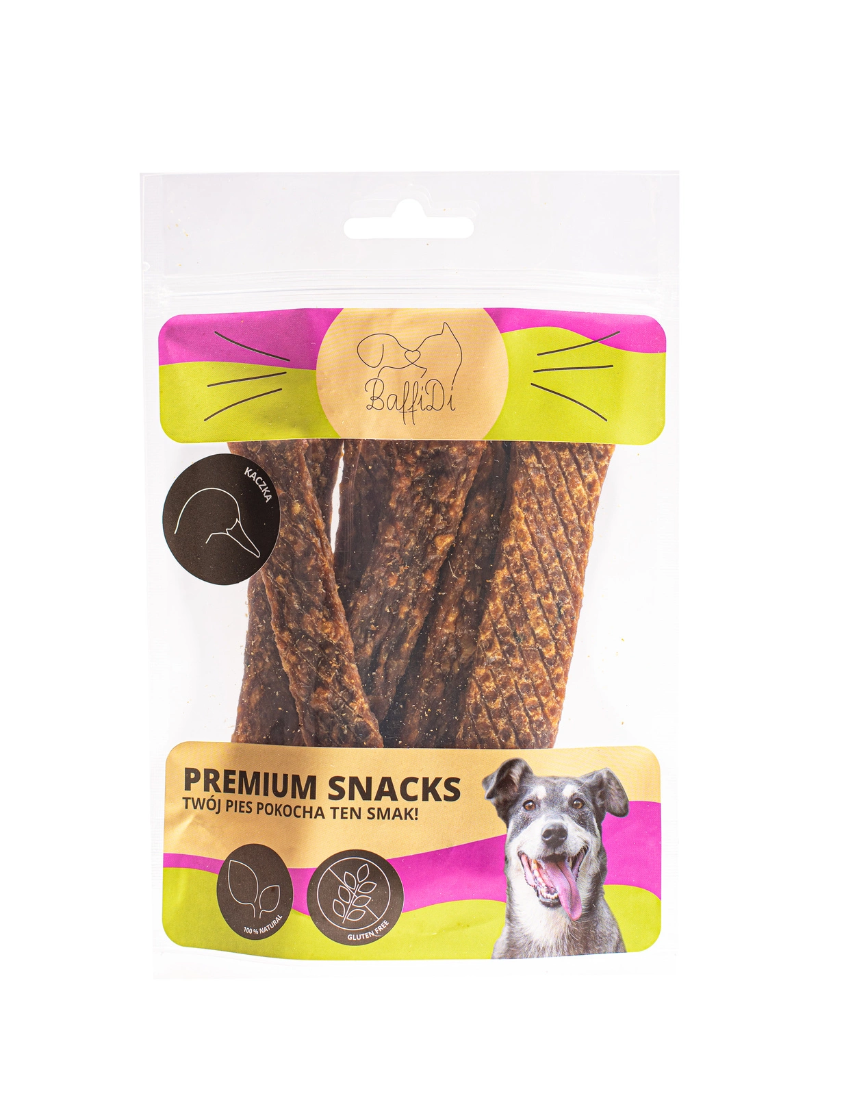 - Naturalny przysmak w postaci łatwo podzielnych pasków marki BaffiDi. Wyprodukowany w Polsce.
