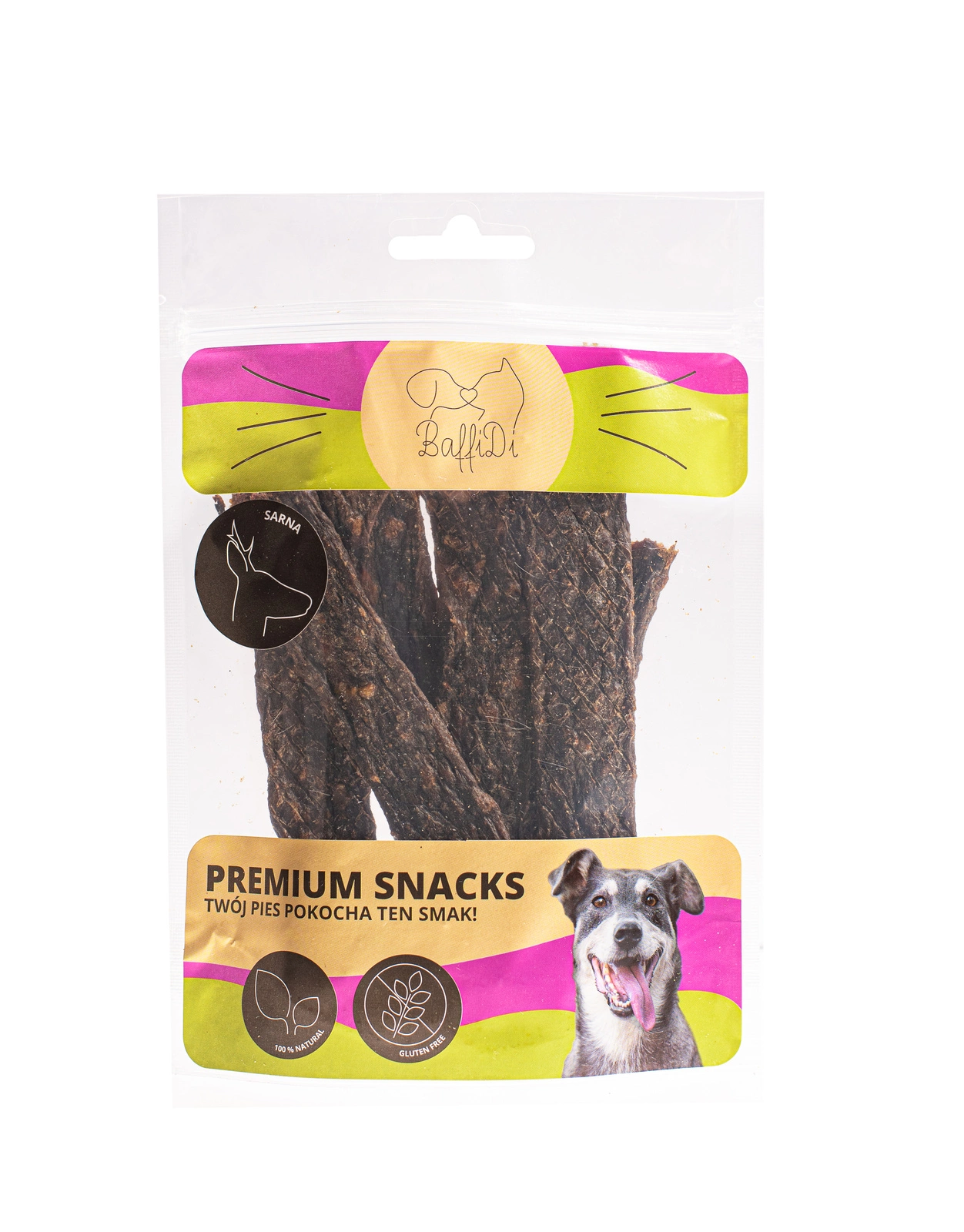 Rozkoszujesz się widokiem swojego psa, który czerpie radość z jedzenia? Zapewnij mu jeszcze więcej radości, podając przysmak marki BaffiDi, jakim jest Suszone mięso w postaci łatwo podzielnych pasków. Wyjątkowy przysmak to ręcznie krojone, najwyższej jakości mięso z sarny, delikatnie suszone ciepłym powietrzem, co zapewnia bezpieczeństwo epidemiologiczne bez konieczności użycia środków chemicznych i konserwujących. Produkt nie zawiera wzmacniaczy smaku, sztucznych aromatów oraz wypełniaczy. Proces suszenia nadaje mu niezwykłej kruchości i chrupkości oraz pozwala zachować wszystkie wartości odżywcze. Nasz naturalny przysmak zawiera 59% mięsa z sarny, 40% (podroby, chrząstki, kości), 1% oleju z łososia. Doskonale nadaje się jako uzupełnienie diety między posiłkami.