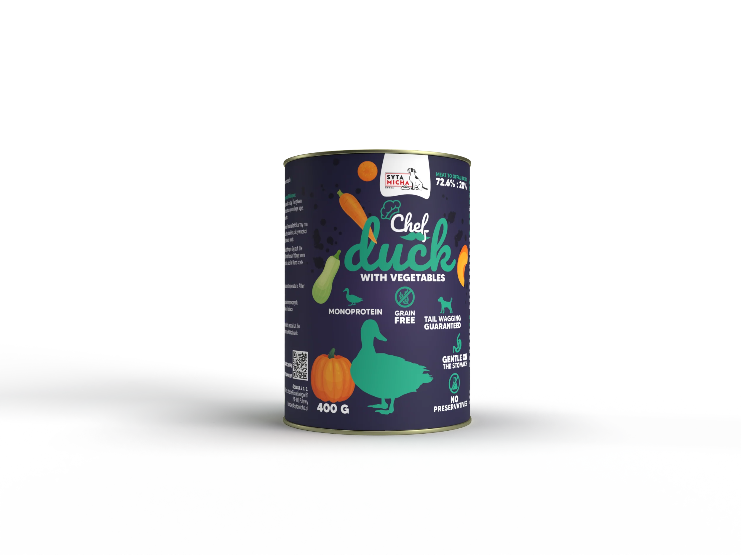 W linii Chef od Sytej Michy znajduje się aż 92,6% produktów pochodzenia zwierzęcego, w stosunku 72.6% mięsa mięśniowego z kaczki do 20% kaczych podrobów (10% żołądki, 5% serca, 5% wątróbka).