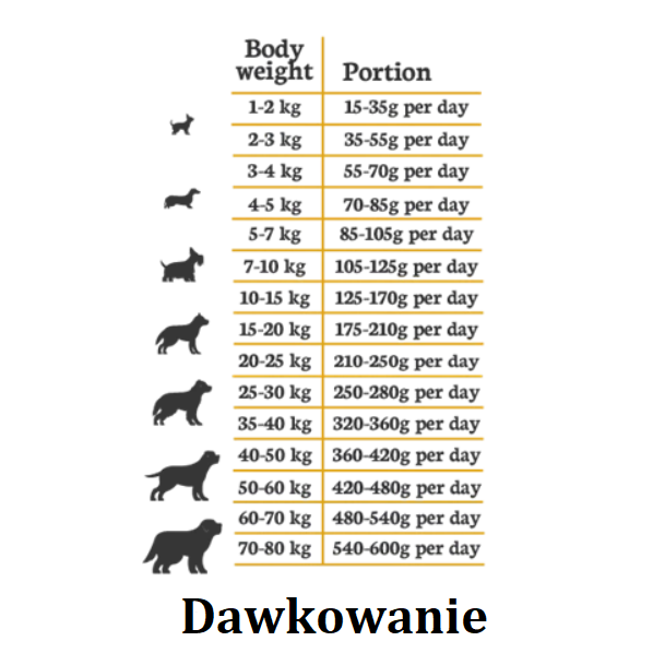 Instrukcje dotyczące karmienia: Karmę można podawać w postaci suchej lub zwilżoną wodą. Ilość podawanej w ciągu doby karmy zależy od wieku, rozmiaru, aktywności zwierzęcia i może różnić się w zależności od warunków środowiska. Należy dbać, aby zwierzę miało zawsze świeżą wodę do picia. Zalecaną ilość dobową przedstawiono poniżej w tabeli żywieniowej.