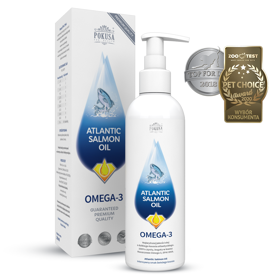 Najwyższej jakości olej z dzikiego łososia atlantyckiego. 100% czysty, bogaty w kwasy tłuszczowe Omega 3, EPA i DHA olej jest doskonałym uzupełnieniem diety psów i kotów. Produkt wpływa na znaczną poprawę kondycji skóry i sierści, łagodzi objawy alergii o różnym podłożu. Kwasy tłuszczowe zawarte w oleju, stabilizują pracę układu immunologicznego, usprawniają ruchomość stawów, wygaszają stany zapalne w tkankach i organach oraz poprawiają wydolność układu sercowo-naczyniowego. Olej z łososia wspiera funkcjonowanie i rozwój układu nerwowego. Olej posiada certyfikat jakości HumanGrade, który jest gwarancją atestowanego produktu spożywczego.