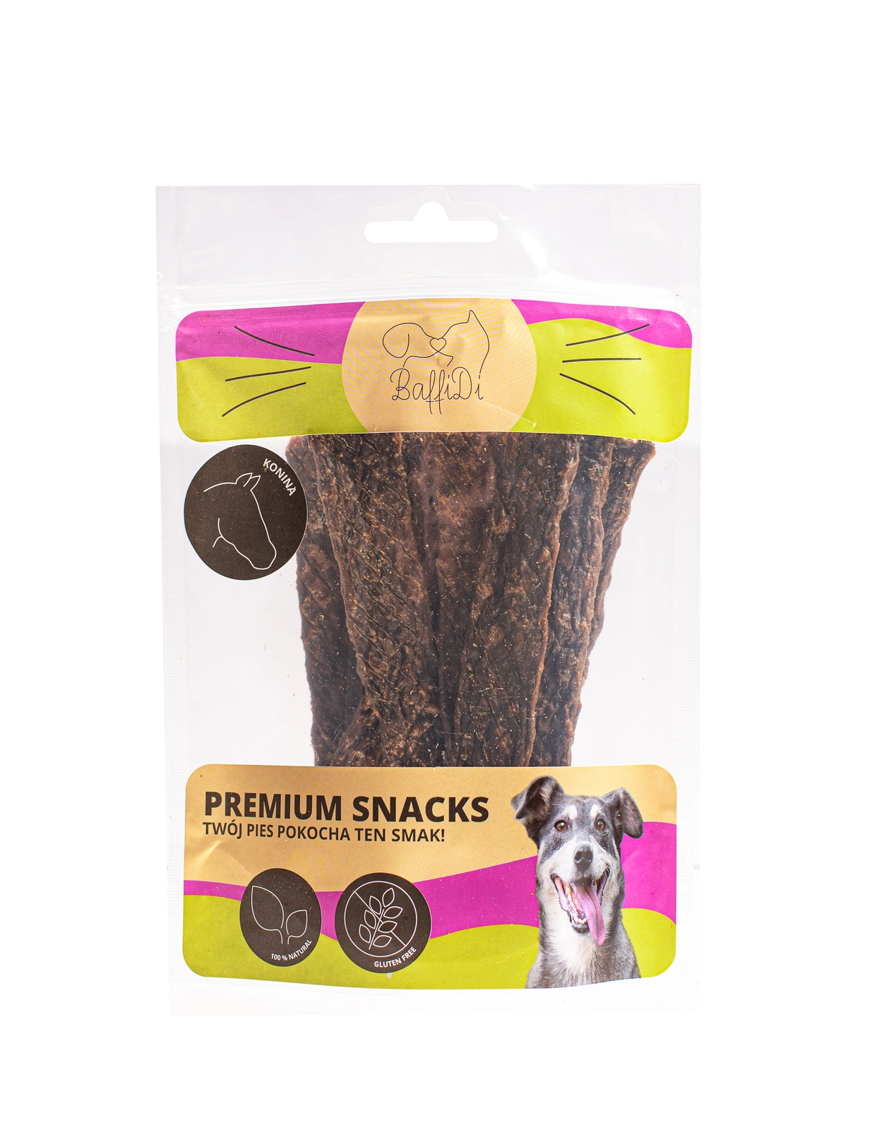 Rozkoszujesz się widokiem swojego psa, który czerpie radość z jedzenia? Zapewnij mu jeszcze więcej radości, podając przysmak marki BaffiDi, jakim jest Suszone mięso w postaci łatwo podzielnych pasków. Wyjątkowy przysmak to ręcznie krojone, najwyższej jakości mięso koniny, delikatnie suszone ciepłym powietrzem, co zapewnia bezpieczeństwo epidemiologiczne bez konieczności użycia środków chemicznych i konserwujących. Produkt nie zawiera wzmacniaczy smaku, sztucznych aromatów oraz wypełniaczy. Proces suszenia nadaje mu niezwykłej kruchości i chrupkości oraz pozwala zachować wszystkie wartości odżywcze. Nasz naturalny przysmak zawiera 59% mięsa koniny, 40% (podroby, chrząstki, kości), 1% oleju z łososia. Doskonale nadaje się jako uzupełnienie diety między posiłkami.