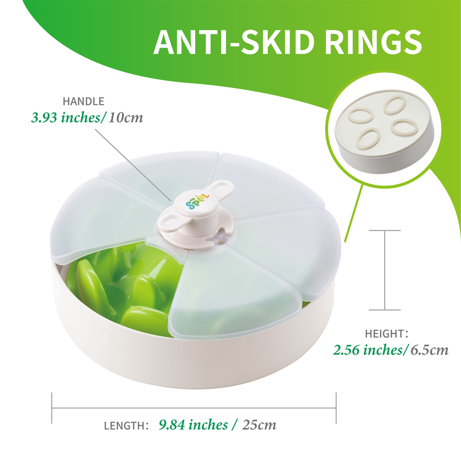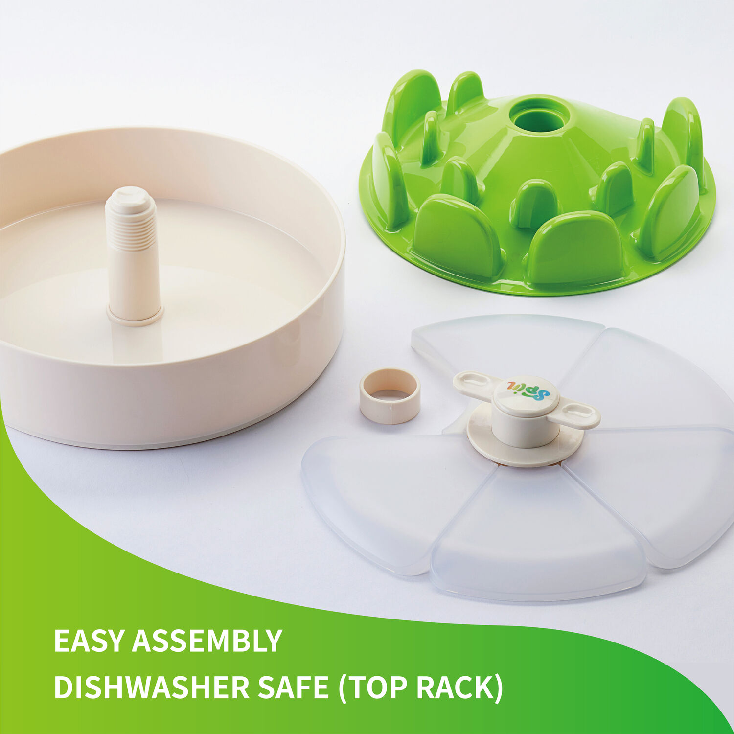 Każda miska Spin może być napełniona różnego rodzaju żywnością: od chrupiących krokietów, po świeże warzywa. Różne kształty i rozmiary przegródek wprowadzają wiele tekstur do odkrywania dla zwierząt.