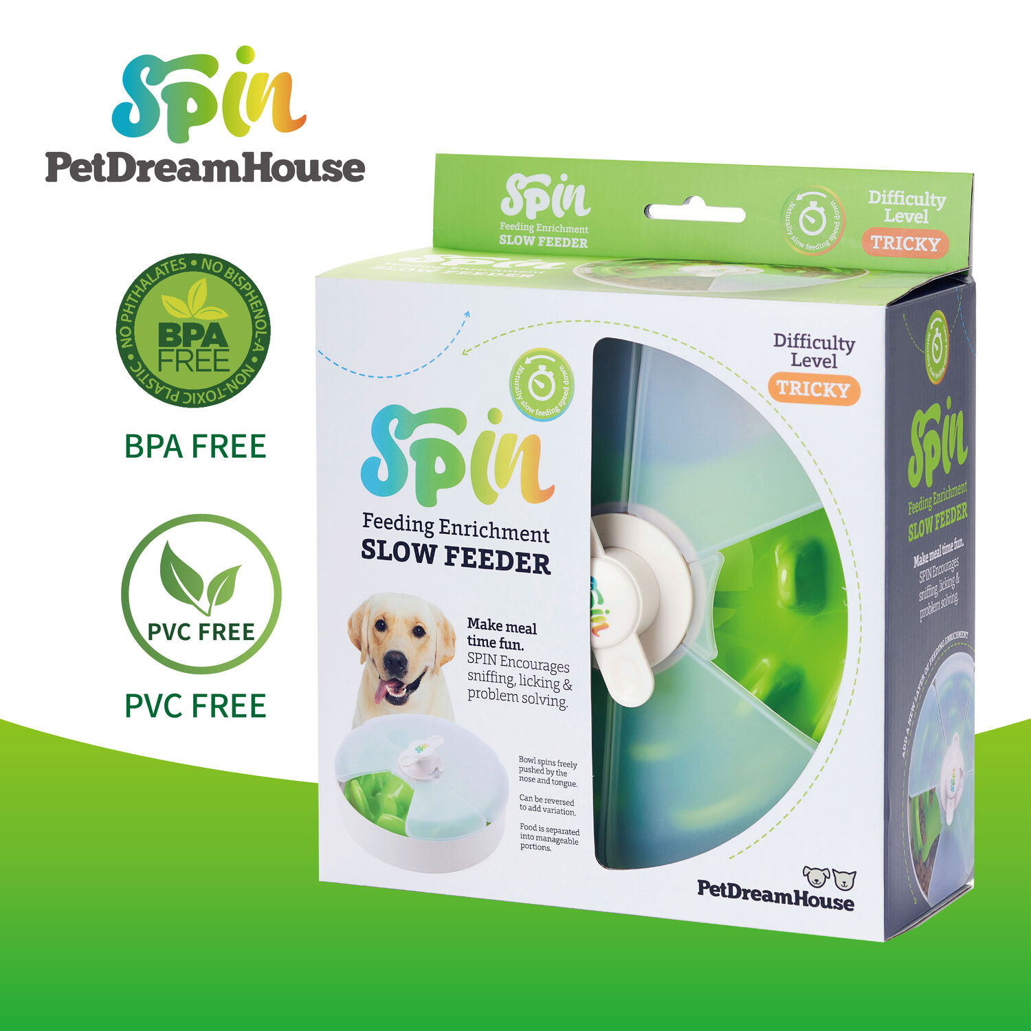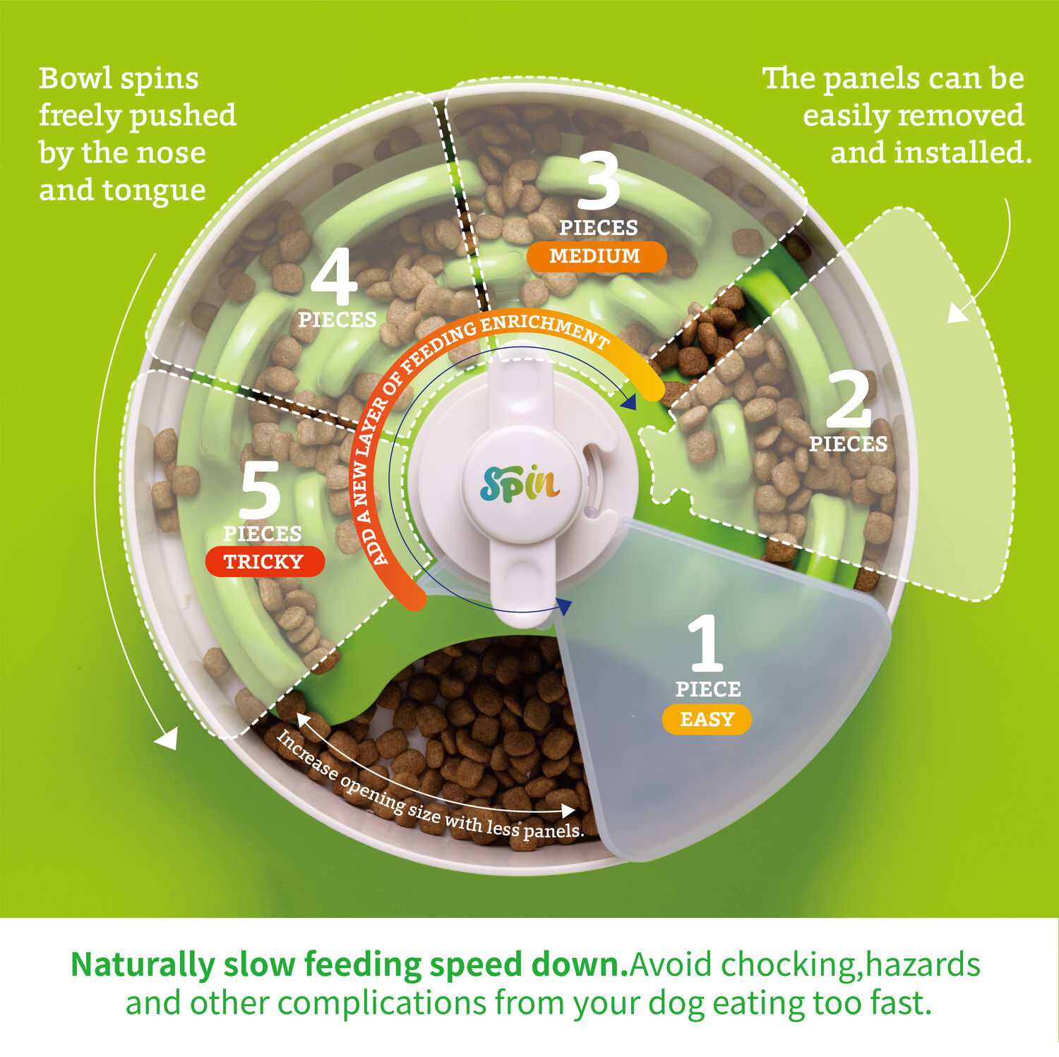 Spin to dynamiczna miska do powolnego karmienia, która zamienia posiłek psa lub kota w zabawę i interaktywne karmienie. Miski Spin zachęcają do wąchania, lizania i rozwiązywania problemów podczas posiłków, co w sposób naturalny spowalnia jedzenie i zapobiega zadławieniu, wzdęciom i zbyt szybkiemu jedzeniu. Każda miska ma wielofunkcyjny centralny element układanki, którego wysokość i opór można regulować, aby dostosować do możliwości pupila lub wprowadzić urozmaicenie. Istnieje także możliwość odwrócenia elementu centralnego. Każda miska ma cztery duże pierścienie antypoślizgowe, które zapewniają wysoką stabilność.