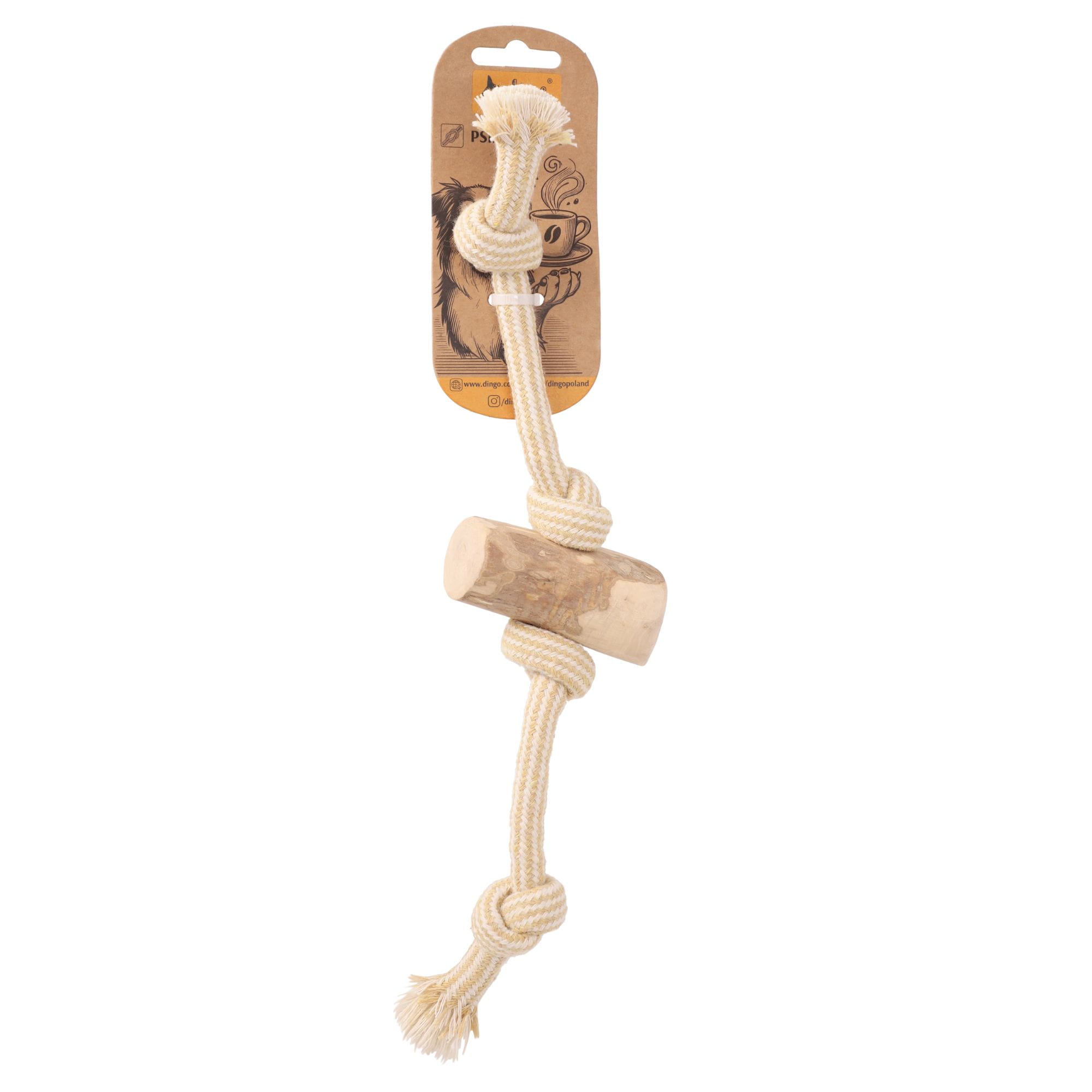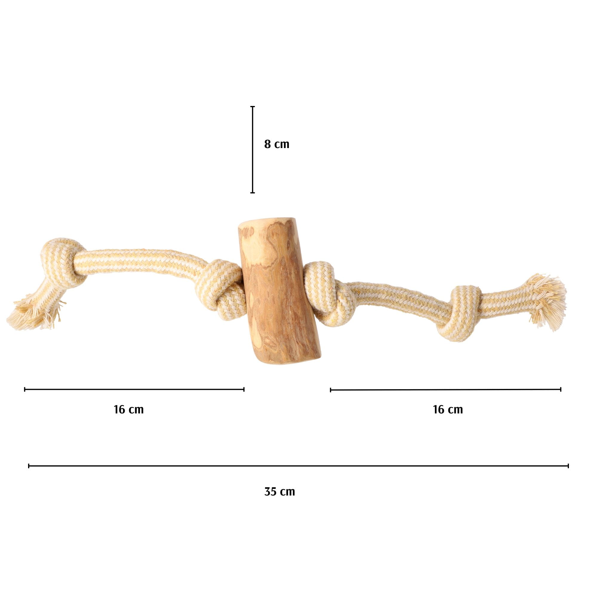 Wykonany z twardego drewna kawowego, osadzony na ultra-mocnym sznurze (60% bawełna, 40% poliester) i wzbogacony aż czterema solidnymi węzłami, gwarantuje jeszcze lepszy chwyt i większą trwałość podczas intensywnych sesji przeciągania i żucia.