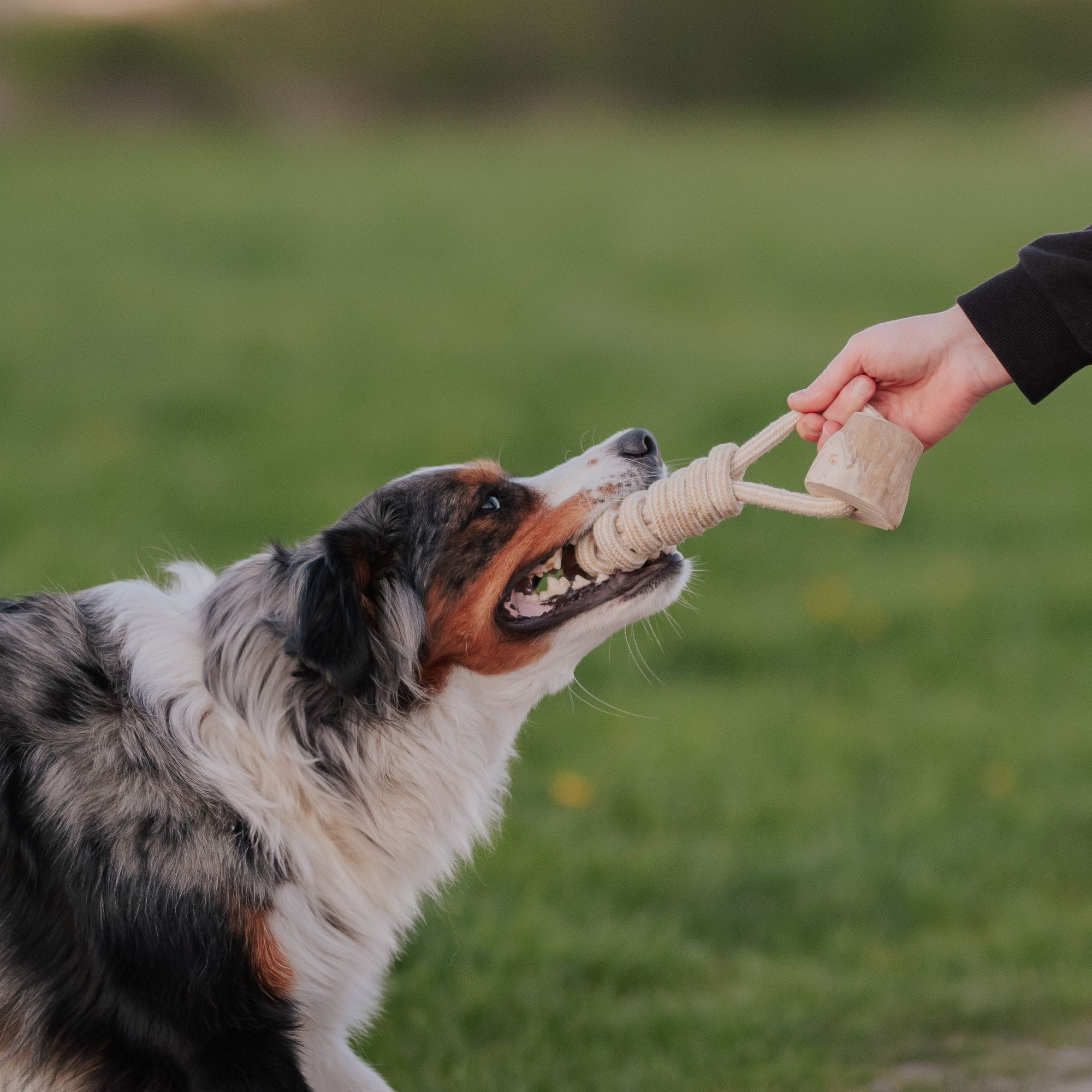 Oto Psia-Kawka Lasso – innowacyjny gryzak stworzony z twardego drewna kawowego, zamocowanego na wytrzymałym sznurze (60% bawełna, 40% poliester) w formie wygodnego lassa.