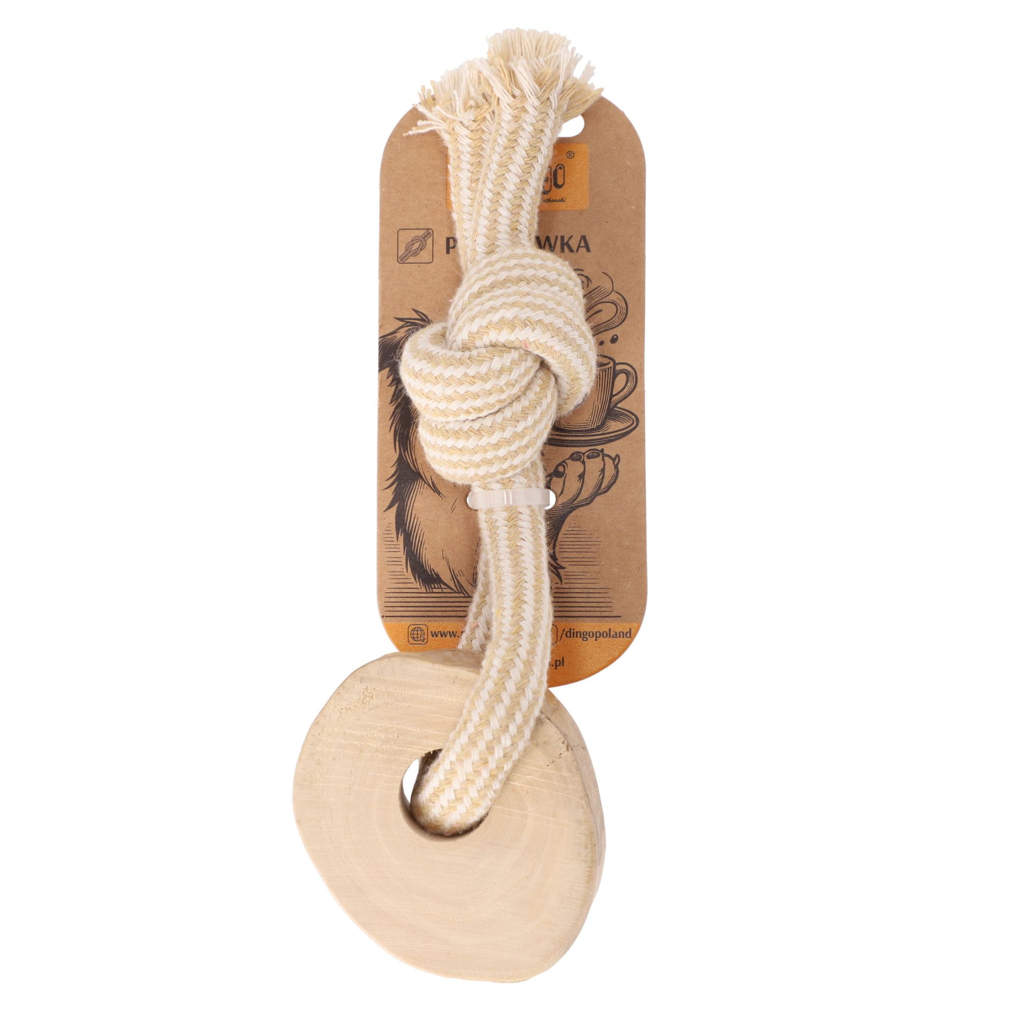 Psia-Kawka Ring to kompaktowy, ale wyjątkowo wytrzymały gryzak dla psów wykonany z naturalnego drewna kawowego i mocnego sznura (60% bawełna, 40% poliester).
